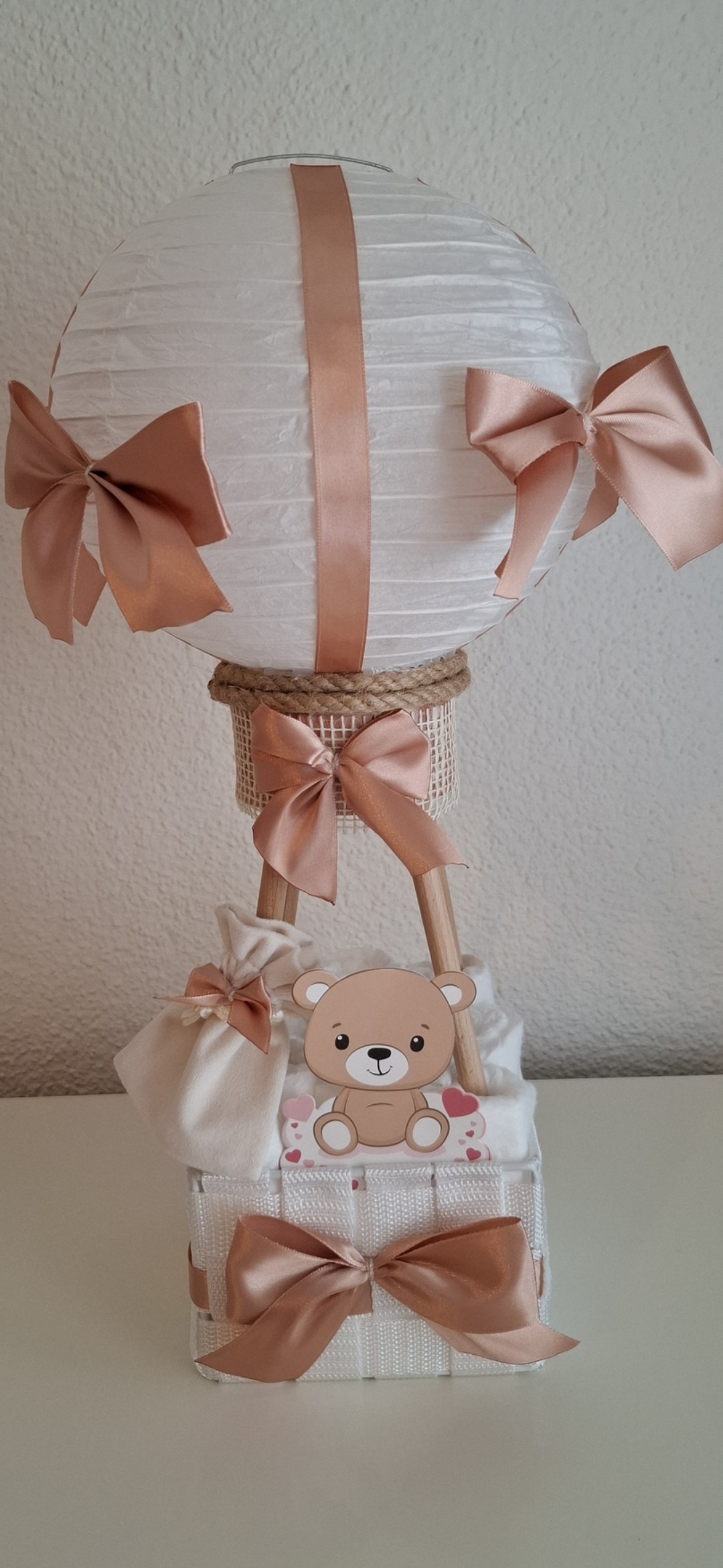 Windeltorte Einzelstück Heißluftballon-Design Diese liebevoll handgefertigte Windeltorte im eleganten Heißluftballon-Design ist eine wunderschöne Geschenkidee zur Geburt, Babyshower oder Taufe. Mit ihren zarten Farben, dem süßen Teddy und den dekorativen Schleifen ist sie nicht nur praktisch, sondern auch ein echter Blickfang.