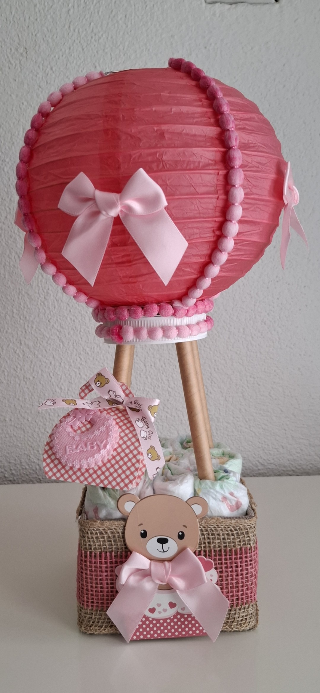 Windeltorte Heissluftballon Einzelstück– perfektes Geschenk zur Geburt oder Baby-Party.Die Windeltorte besteht aus 54 Pampers Windeln (Grösse 6–10 kg) und ist liebevoll mit 22 Rosen und dekorativen Elementen gestaltet. Ein grosser Ballon macht dieses Geschenk zu einem besonderen Highlight.Dekoratives Teddy-Motiv aus Karton (keine Spielzeugfigur)